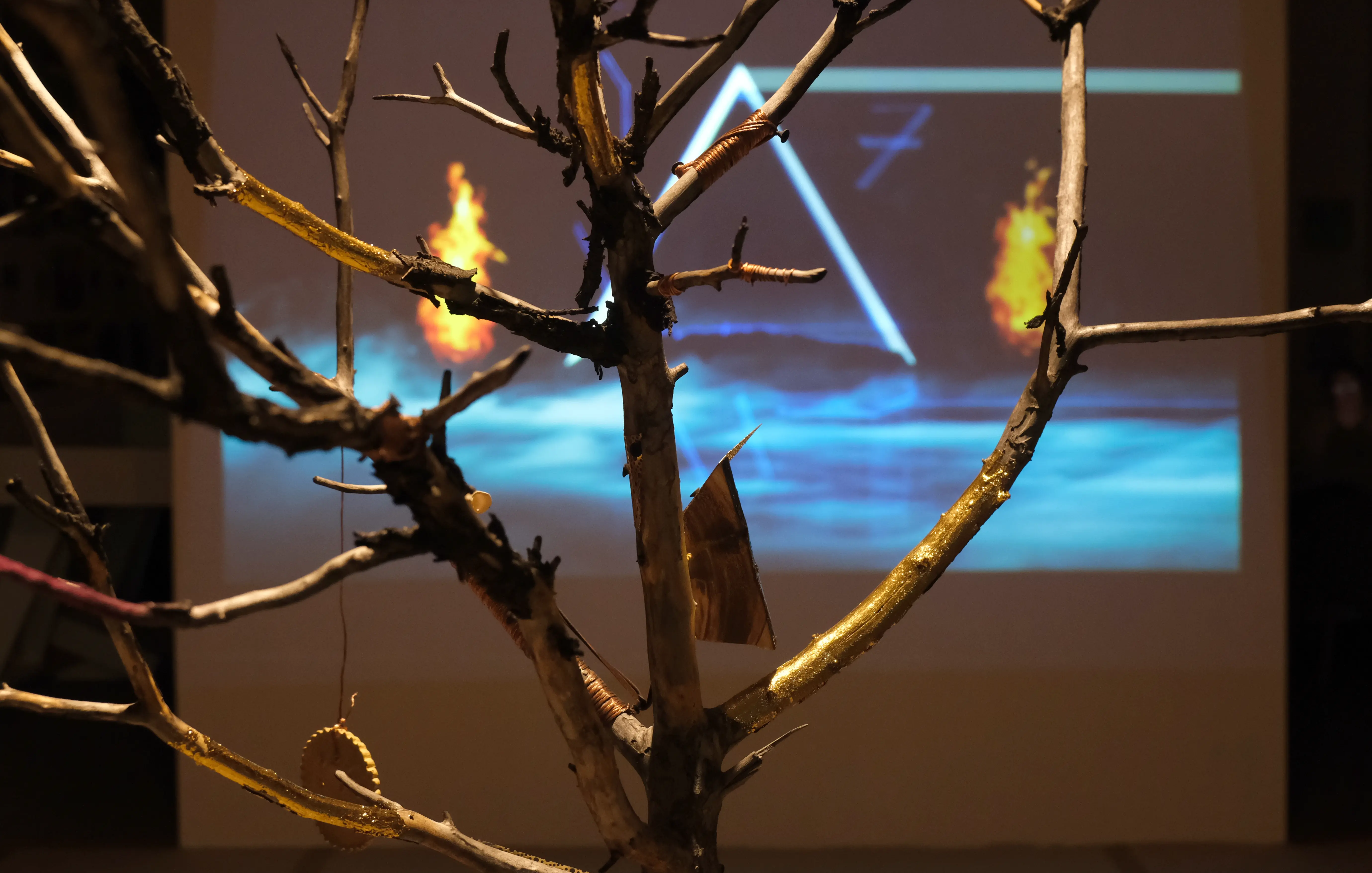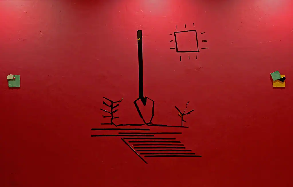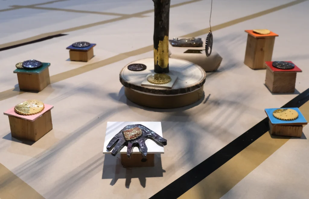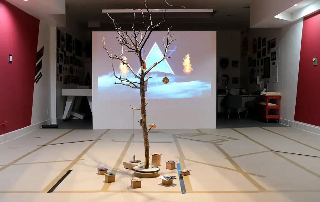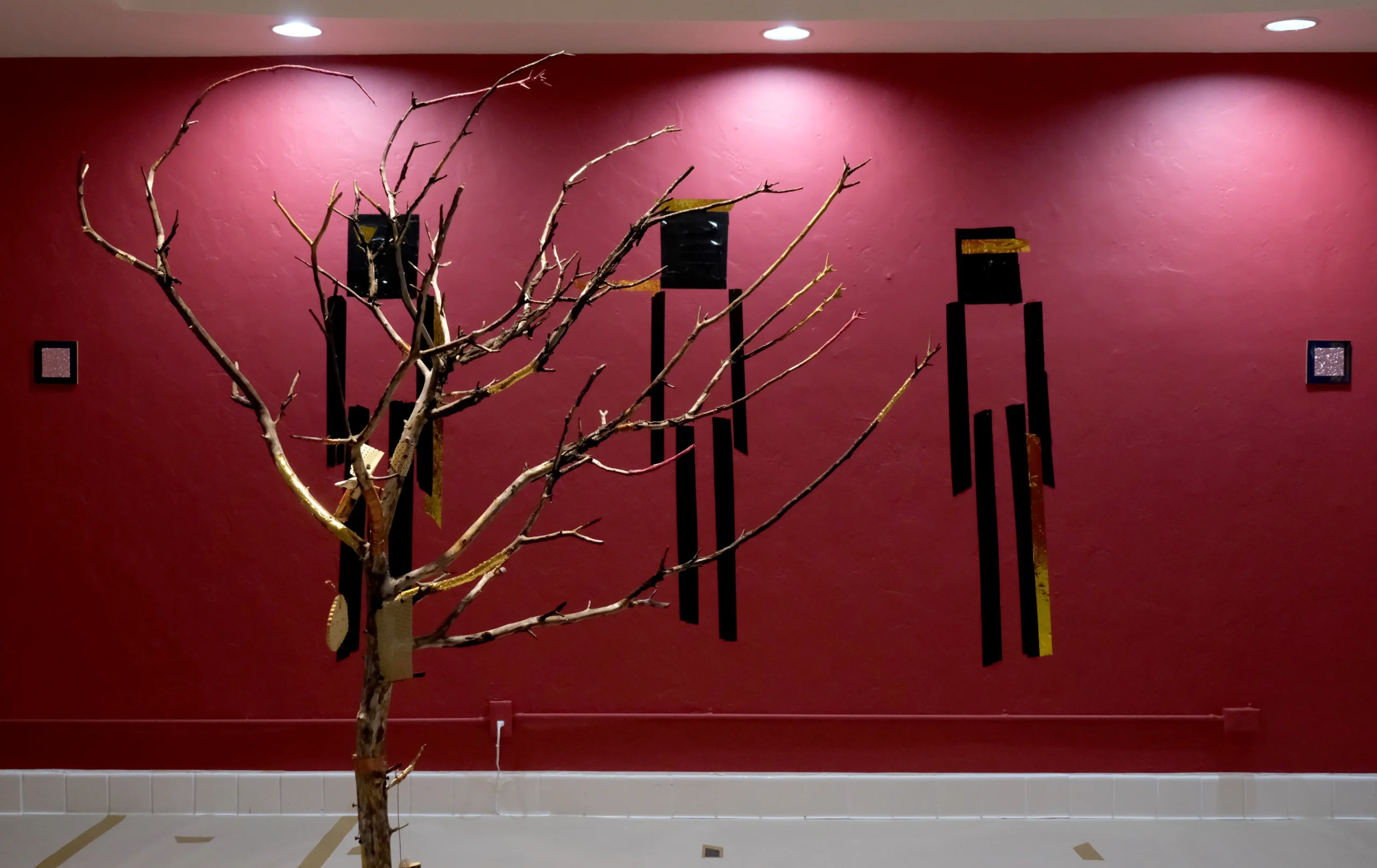 Estrada showcases a variety of artistic media, including installations, video, drawings, and sculptures. At the center of the gallery lies the Almendroide, which serves as the focal point connecting the rest of the artwork. Wall one features a human figure representing someone still on this earthly plane. The middle wall displays a video that suggests a bridge between dimensions. Wall three presents another human figure potentially situated in a different dimension. This time, the artist is more aware and conscious of his creative process, his ideas, and ways of representation.