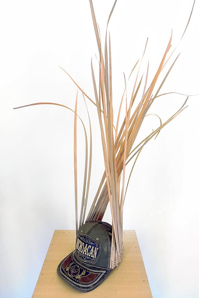Image: Isidro Pérez García, Por debajo de la mesa: Terreno familiar, 2023. Wood, woven tule (gathered from nature reserve), acrylic paint.