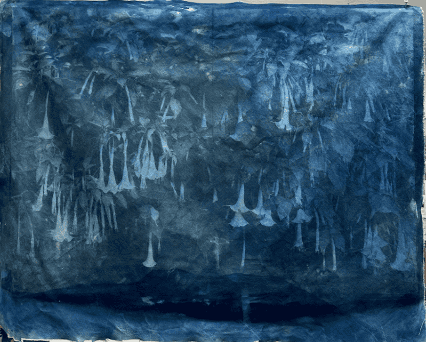 Amina Cruz's cyanotype Sueños (2025) depicts a cascading canopy of angel's trumpet flowers bathed in a sea of murky blue. The dizzying, dreamlike scene mimics the hallucinogenic effects of ingesting the plant. To produce her ethereal cyanotypes, Cruz repeatedly stains her photographs with tea, coffee, and other organic materials. This languid, painstaking undertaking constitutes a ritualized act of spiritual communion in and of itself. Through this alchemical process of staining and obscuration, Amina untethers her photographs from their real-world subjects, creating portals to worlds both eerily familiar and uncanny.