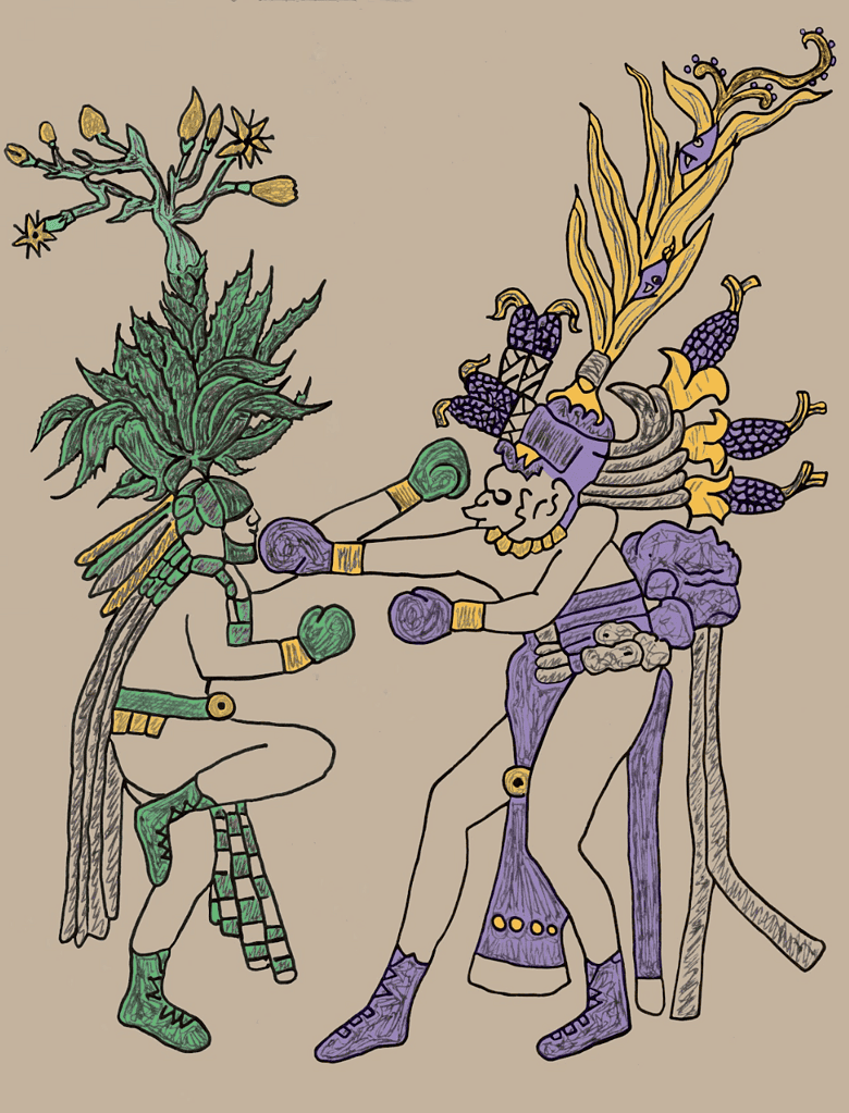 Fernando Corona's FIELD TRIP (2023) is a kaleidoscopic, psychedelic celebration of agricultural labor and ancestral knowledge systems, as much as it is an indictment of borders and the regimes of surveillance and militarism that sustain them. A cannabis plant occupies the center of the composition, with ears of corn emerging from below, and cotton rising above. Corona's inclusion of the three crops vital to Californian agricultural production references the milpa—an Indigenous agricultural practice originating within Maya communities, wherein farmers grow corn, beans, and squash together to form a self-sustaining biodiverse miniature ecosystem. Corona's inclusion of corn here is almost ironic—whereas the Maya grew various corn species, the corn occupying the center of Corona's composition has been genetically modified to prioritize efficiency and high yields. Unlike the standardized, mechanized process of monocultural agriculture that extracts from the land, the milpa is sustained through communal practice and reciprocity with the environment. The drones hovering above the fields symbolize the surveillance regimes that facilitate rapid agricultural production through suppression of workers' autonomy and protection of corporate knowledge.