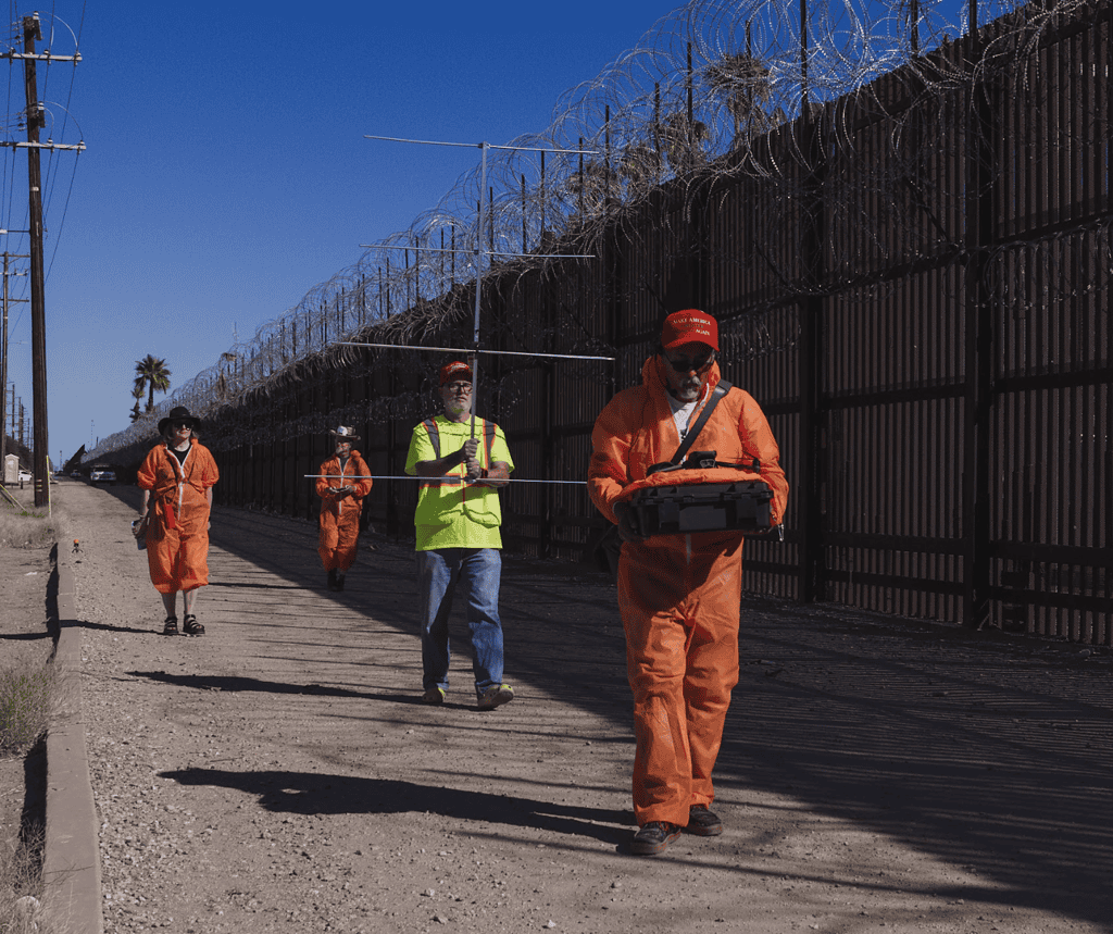 Electronic Disturbance Theater 3.0 (E.D.T.) staged a performance-happening at the Calexico–Mexicali border wall titled Social Echologies: Scene 3 (from Three Echologies: An Á/Area//Aria X Play). The artist collective had staged the two scenes that preceded this one in San Diego and Mexico City, respectively. Wearing red “MAKE AMERICA GREATER MEXICO AGAIN” hats and orange hazmat suits, half of the collective was positioned on the Calexico side of the border, the other half in Mexicali, a configuration that resembled past Biennial performances. Two performers spoke into microphones connected to bluetooth speakers suspended from two remote-controlled miniature drones, the performers’ voices variously in/audible against the dynamic sounds of queuing cars, vendadores, and a street busker along the Mexicali side. The drones were “palindrones,” rasquache replicas of Predator drones, the remotely piloted aircraft used by the U.S. Air Force for reconnaissance and combat in wars around the world. The performance was transmitted through two antennae, one on each side of the border, creating an interface between the play’s local broadcast on radio and the “a(e) ria(l)” disturbance of the palindrones searching out, chasing, and “singing” this scene of the play to U.S. Homeland Security. This “echolocating” sound gesture summoned subaltern knowledge of past, present, and future farmworkers, migrant laborers, and Zapatistas in an area reconfigured as “X.” During the performance, neither palindrone breached the border, but the one on the U.S. side mysteriously crashed, or was shot down, as U.S. border patrol and Mexicali police lurked behind the scenes.
