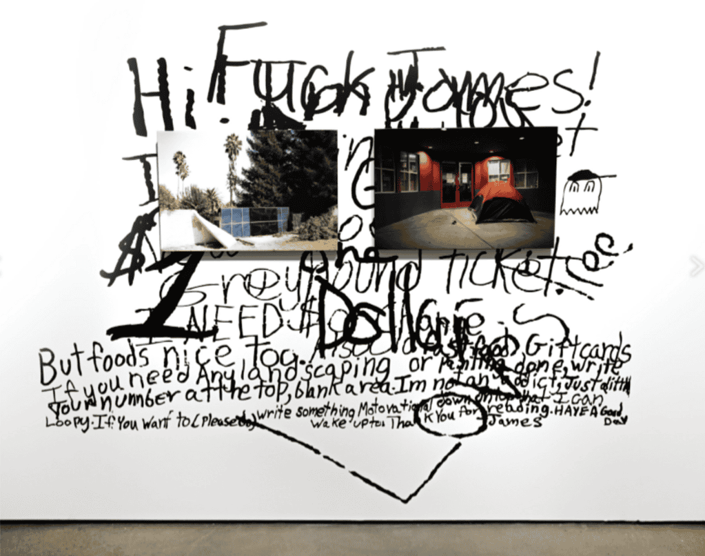Julio Romero's multimedia installation is composed of two digital photographs, Silicon Valley XX (2015) and Silicon Valley XIV (2014), set against Gracias por leer (2015), which consists of black text scribbled onto the gallery wall. While Silicon Valley XX depicts a site of urban refuse amidst a sunny sky and rows of palm trees, Silicon Valley XIV captures a tent—likely a makeshift domicile belonging to an unhoused person—in front of the closed entrance to a building at night. The ironic inclusion of "Silicon Valley" in the title of both photographs refers to the unprecedented accumulation of capital in tech industries occurring alongside a cost of living crisis in California that threatens economic precarity for members of the working class. For Gracias por leer, Romero frantically scribbled pleas for work, declarations of his sobriety, and a request for a Greyhound bus ticket, all of which are ubiquitous on signs held up at traffic stops and intersections by those experiencing homelessness.