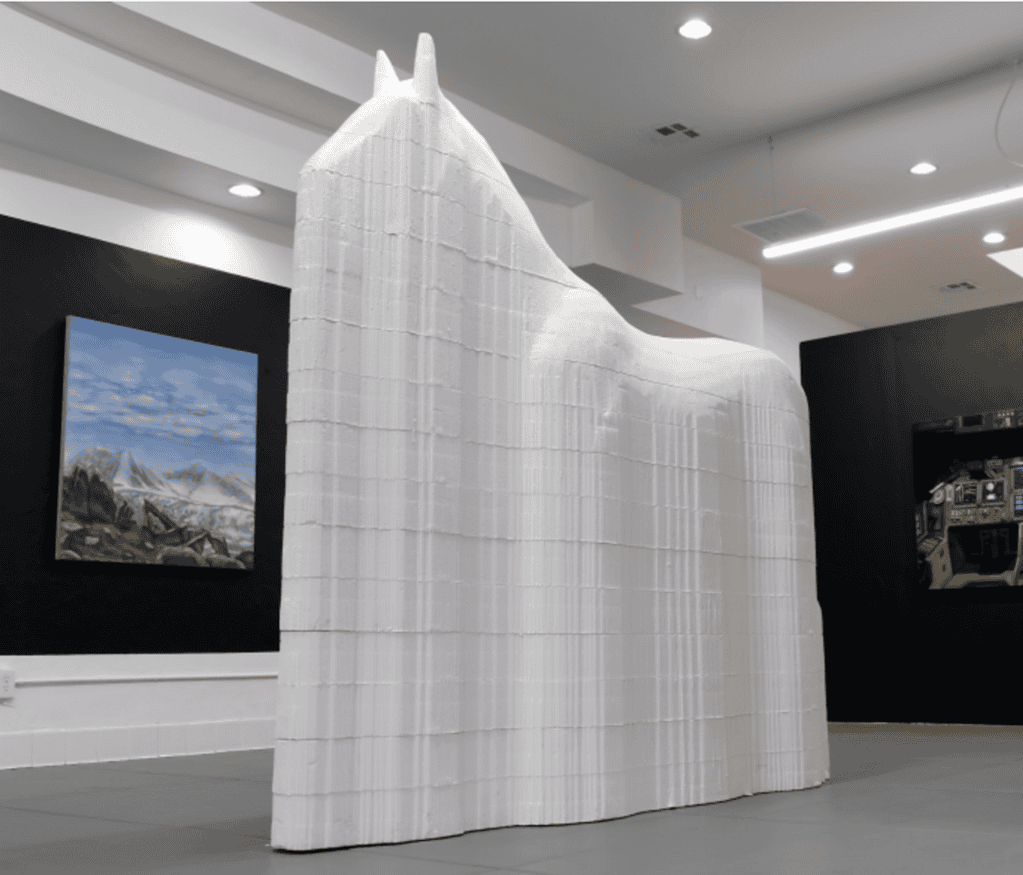 for the PARA/normal Borders Lab. This show—a minor survey of Gomez’s broader art practice—highlighted themes of the sacred and the universal through imagery of space exploration, extraterrestrial presence, and apocalyptic myth. Shown here is a painting from Gomez’s Horsemen series, which consists of four life-size works, each offering a contemporary interpretation of the Four Horsemen from the Book of Revelation.
