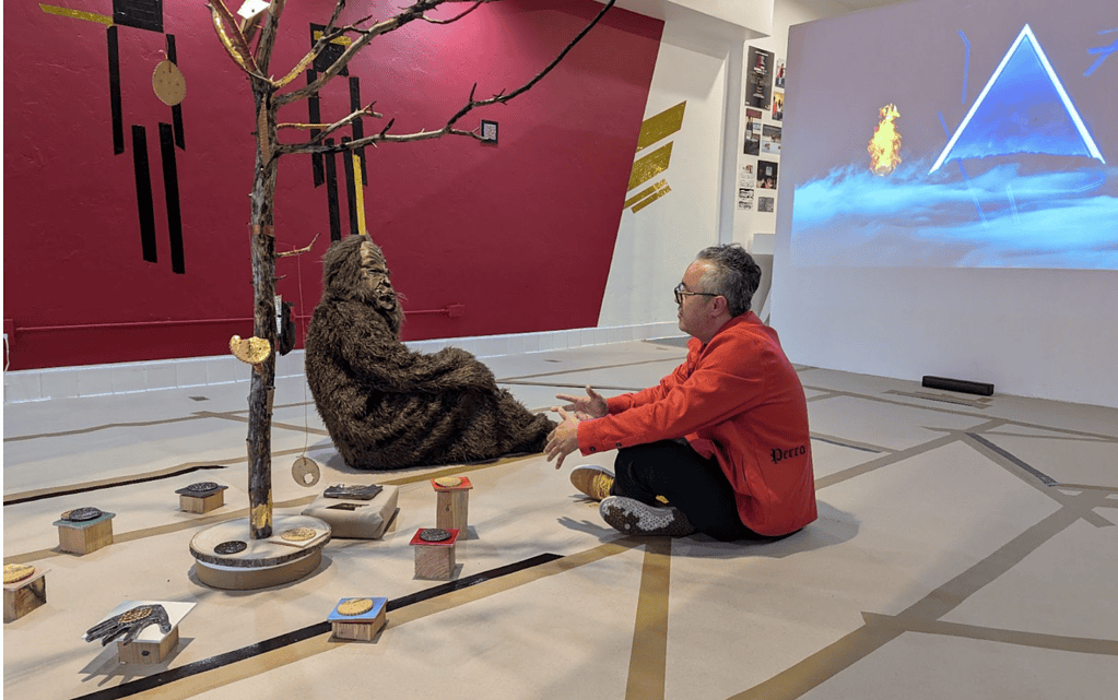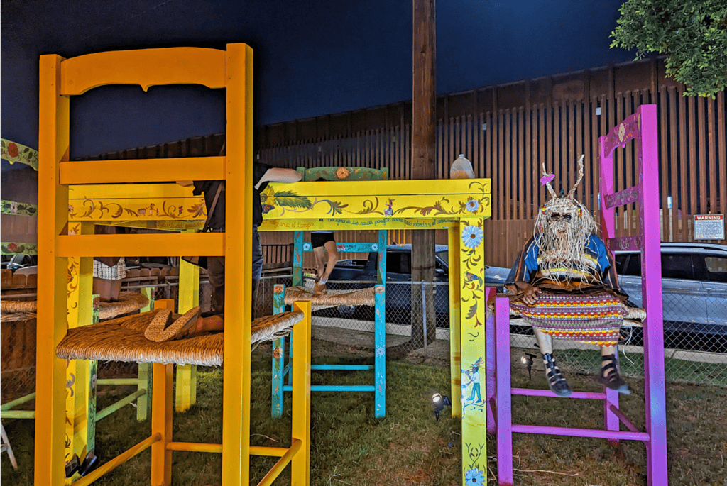 Isidro Pérez García's Por Debajo de la Mesa: Terreno Familiar | Under the Table: Familiar Terrain is centered around a large-scale table and chairs through which the artist explores his familial connection to the way of life in the biocultural archives of plants. Perez Garcia uses natural weaving materials that are shared across borders – such as tule (cattails) and maguey - to comment on the sacrality of the borderlands. For PARA/normal Border Lab, the artist showcased multimedia works that wove themes of ritual, migration, environmentalism, and ancestral art practices that exemplify notions of Eden.