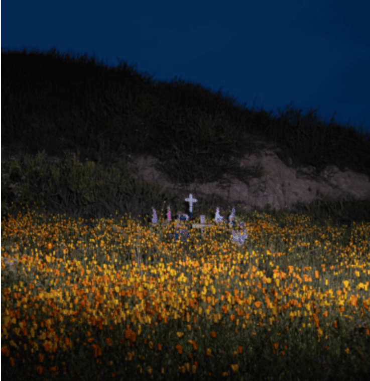 The MexiCali Biennial collaborated on a series of research guides with the Library of Congress including a StoryMap focused on concepts and artists featured in Land of Milk & Honey. This visual research guide, which features Pérez García’s work, can be found within their digital archives: https://storymaps.arcgis.com/stories/7d33b3cdaa864bd293a7133def5b584b