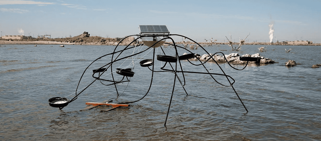 In 2013, Dominic Paul Miller collaborated with a team of engineering students to create a site-specific sculpture at the Salton Sea in Southern California. A sculpture was conceived as a passive desalination system that utilized a solar-powered pump and evaporation trays to precipitate fertilizer-rich salts directly from the shallow waters of the sea. As part of the design process, the engineers and Miller discussed the complicated ecology of the area, including the issues of toxic fertilizers entering the sea from agricultural run-off waters and the many bird species that inhabit or migrate through the region. The project remained there for nine years, long after the shoreline had receded well beyond the sculpture’s location. The sculpture remained largely undisturbed apart from the blasting sun, erosion, and the occasional bird. The decaying remnants of Salt Exclosure was part of the MexiCali Biennial's Land of Milk & Honey exhibition at the Cheech Marin Center for Chicano Arts and Culture of the Riverside Art Museum.