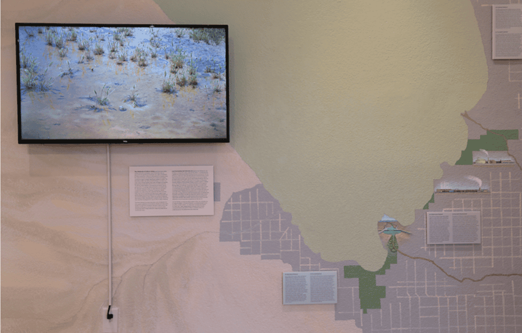 Artist Cynthia Hooper's The Wetlands of Lithium Valley examines three wildlife habitats along the southeastern shore of the Salton Sea—an agricultural and geothermal landscape now being mined for lithium. Hooper's multimedia installation addresses ecological stress on the fragile environment from the extraction of an ever-growing dependence on the metal used in batteries, electric cars, and cell phones, as well as a treatment for certain mental disorders. Projects such as the Species Conservation Habitat are highlighted in this work to draw attention to the environmental protection of the southeast Salton Sea wetlands by creating a lower-salinity refuge for "zombified" species such as the Desert Pupfish.