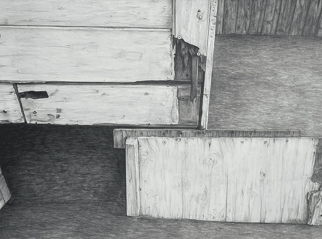 The drawing was included in UN/belonging in the Land of Milk & Honey at BEST PRACTICE in San Diego in 2023. Curated by Emmanuel Ortega, the two-person exhibition featuring MexiCali Biennial co-founders Hernandez and Ed Gómez explored landscapes shaped by shifting boundaries. In MexiCali Biennial: Art, Actions, Exchanges since 2006, Ortega describes the ambivalence of border space in Hernandez’s work, writing: “The ambiguity of seemingly banal objects receiving academic artistic rigor reinforces the ambivalence of the space surrounding the border. Yet their haunting presence around the Casa also redirects their ephemerality into a critical demarcation point where the physical violence of imperial bounds is revealed.” This representation of a damaged crawl space is more than architectural residue—it portrays a haunted threshold, where the border’s invisible violence inscribes itself onto the surrounding architecture.