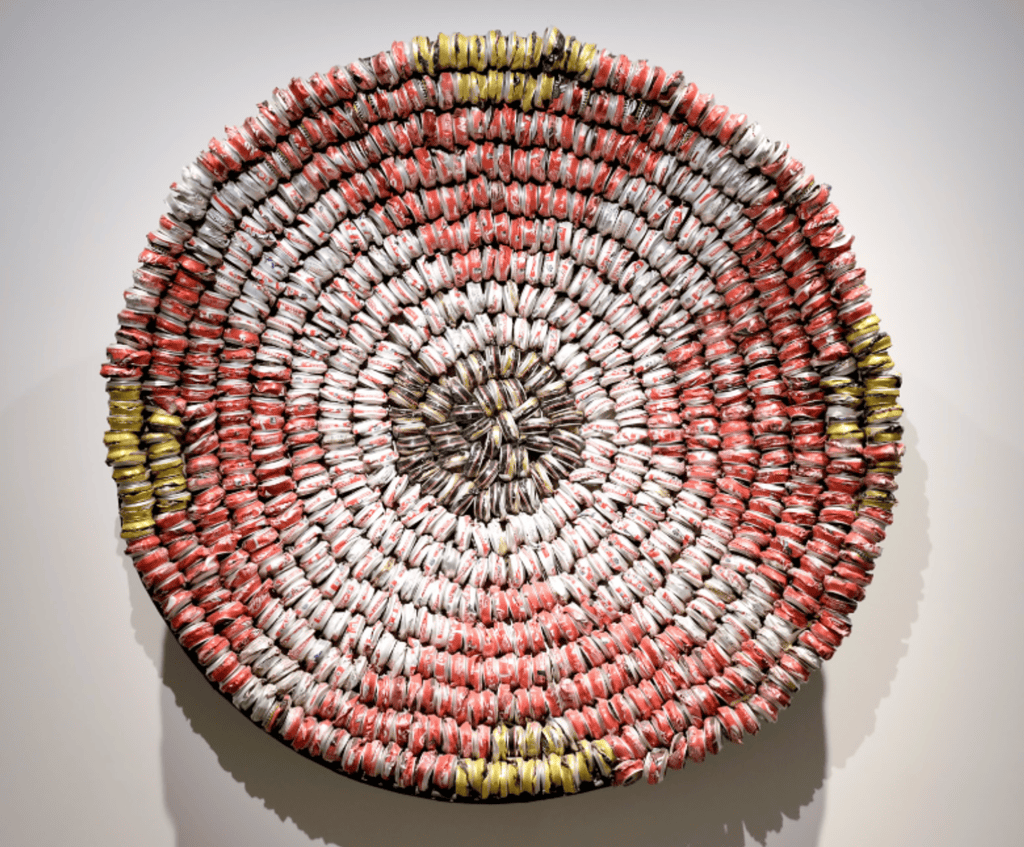 Image: Gerald Clarke, Continuum Basket, 2000. 668 compressed aluminum cans, polyester resin mounted on satellite dish. Courtesy of artist and Idyllwild Arts Foundation.