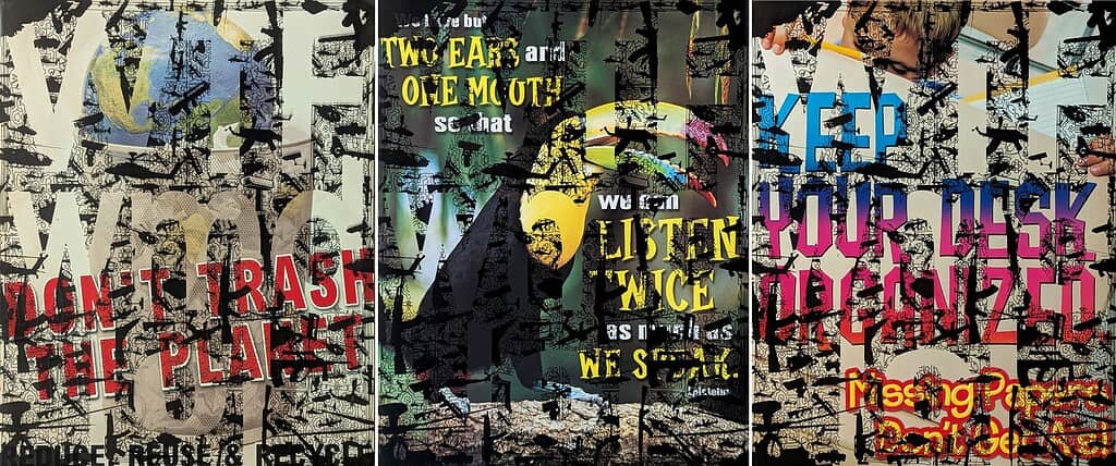 Gómez disrupts this logic by layering modular screenprinted forms onto the posters and encoding them with the acronyms “WTF,” “WMD,” and “LOL.” These signals mirror the language of contemporary media culture, where meaning is reduced to shorthand and emotional reaction. “WMD,” in particular, references the Weapons of Mass Destruction narrative used to justify the U.S. invasion of Iraq—an emblem of how misinformation, fear, and authority converge. The recurring presence of Apache helicopters reinforces the visual language of militarized power and surveillance.